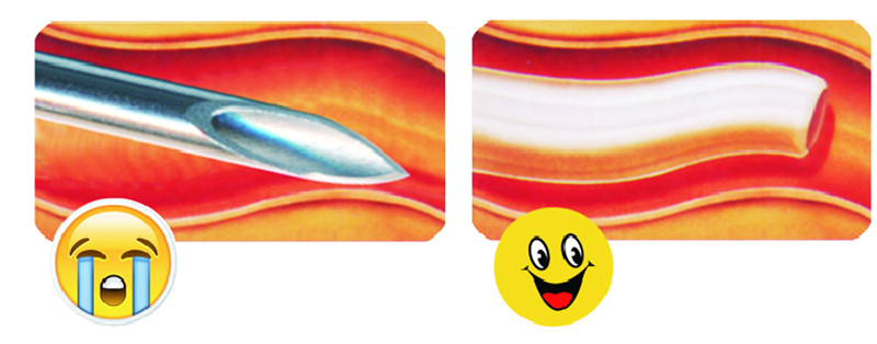 ● 導管針代替頭皮針 ,導管進入血管后變得更柔軟,在血管內(nèi)呈漂浮狀態(tài) ,減少了對血管壁的刺激,更好的保護血管 ;
